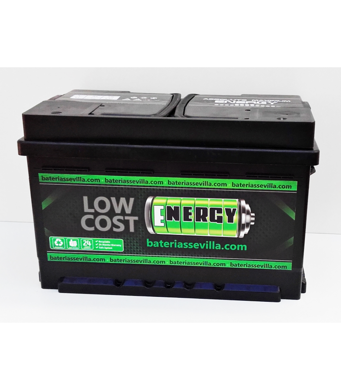 Batería de Arranque de coche de 12V y 74Ah con pico de arranque de 630A (EN). Sin mantenimiento. Con caja de las siguientes dimensiones (Largo x Ancho x Alto): 278 mm x 175 mm x 190 mm. Borne positivo a la izquierda. Pertenece a nuestra gama estándar Low Cost Energy, en la que puede encontrar una batería válida para una amplia gama estándar de turismos de los principales fabricantes: Alfa Romeo, Audi (A1, A2, A3, A4,...), BMW (serie 1, serie 3,serie5,...), Chevrolet, Citroen (C1, C3, C4, C5, Picasso, Cactus, Saxo, Xantia, Xsara,...), Dacia (Dokker, Duster, Lodgy, Logan, Sandero,...), Daewoo (Lanos, Nubira,...), Fiat (Punto, Brava, Bravo, Tipo, Panda, 500,...), Ford (Fiesta, Mondeo, Focus, B-Max, C-Max, Escort, Ka, Kuga, Tourneo, Galaxy, Taurus, Transit,...), Honda (Civic, Jazz, Accord, CR-V, HR-V,...), Hyundai (I10, I20, I30, I40,Elantra, Accent, Matrix,...), Kia (Optima, Picanto, CEE'D, Rio, Venga, Carens,...), Lada, Lancia, Mazda (mazda2, mazda 3, mazda5, mazda 6, CX-3,...), Mercedes Benz (Clase A, Clase C, Clase S, Vito, Citan, Clase B,...), Mini, Mitsubishi, Nissan (Micra, Almera, Juke, Primera, Qashqai, Vanette, Versa,...), Opel (Astra, Agila, Combo, Corsa, Insignia, Meriva, Mokka, Vectra, Vivaro, Zafira,...), Peugeot (106, 108, 206, 207, 208, 306, 307, 308, 406, 407, 1007, Traveller,...), Renault (R-19, Clio, Espace, Express, Fluence, Kangoo, Koelos, Laguna, Megane, Modus, Captur, Scenic, Trafic, Twingo, Talisman,...), Rover, SEAT (Alhambra, Altea, Arosa, Cordoba, Exeo, Ibiza, Inca, Leon, Marbella, Mii, Toledo,...), Skoda (Citigo, Fabia, Octavia, Rapid, Roomster, SuperB, Yeti,...), Suzuki (Aerio, Alto, Baleno, Vitara, Ignis, Swift, SX4,...), Tata, Toyota (Auris, Avensis, Aygo, Corolla, Verso, Cruiser, Matrix, Rav4, Vitz, Yaris,...), Wolkswagen (Arteon, Bora, Caddy, , Caravelle, Derby, Eos, Golf, Multivan, Jetta, Lupo, Beetle, Passat, Polo, Routan, Scirocco, Sharan, Tiguan, Touareg, Touran, T3, Transporter, up,...), Volvo, etc.
