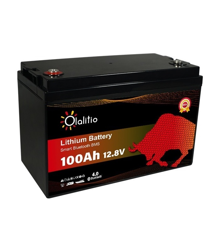 Batería de Litio tipo LiFePo4 de 12.8V y 100Ah (1280Wh) de la marca Olalitio. Medidas: 328*172*212 mm. Con Smart Bluetooth BMS. Aplicación en Autocaravana, caravana, barco, instalaciones solares, ...