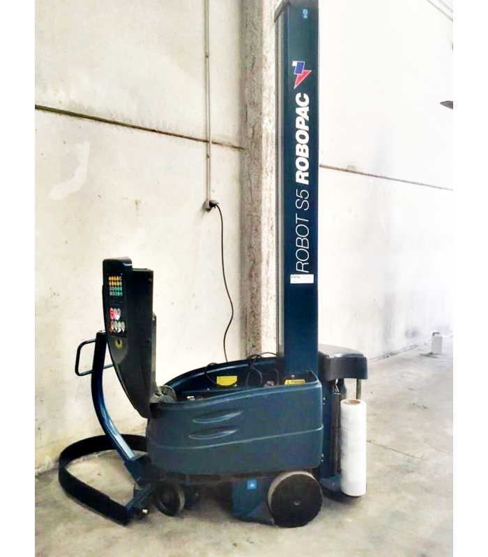 Robot envolvedor filmador vertical de ocasión autopropulsado de la marca ROBOPAC modelo ROBOT S5 para embalaje con film extensible, envolvedora filmadora enfardadora de palets.