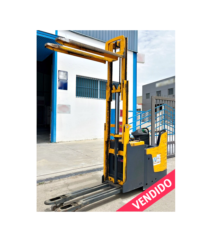 Transpaleta y apilador eléctrico de 2000Kg de hombre a bordo, del conocido fabricante alemán Jungheinrich modelo ERD 220 con elevación de base y batería de 24V.